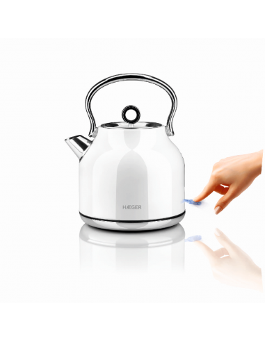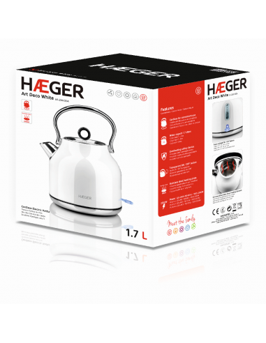 Electric Jug HAEGER ART DECO WHITE with 2200W of power, 1.7 L capacity - wireless system, body and hidden resistance in stainless steel, 360º rotating base. Capacity: 1,7 L Power: 2200W Stainless steel body 360º rotatable base Concealed resistance in INOX Water level indicator Auto power off Overheating protection Safety device against dry running
