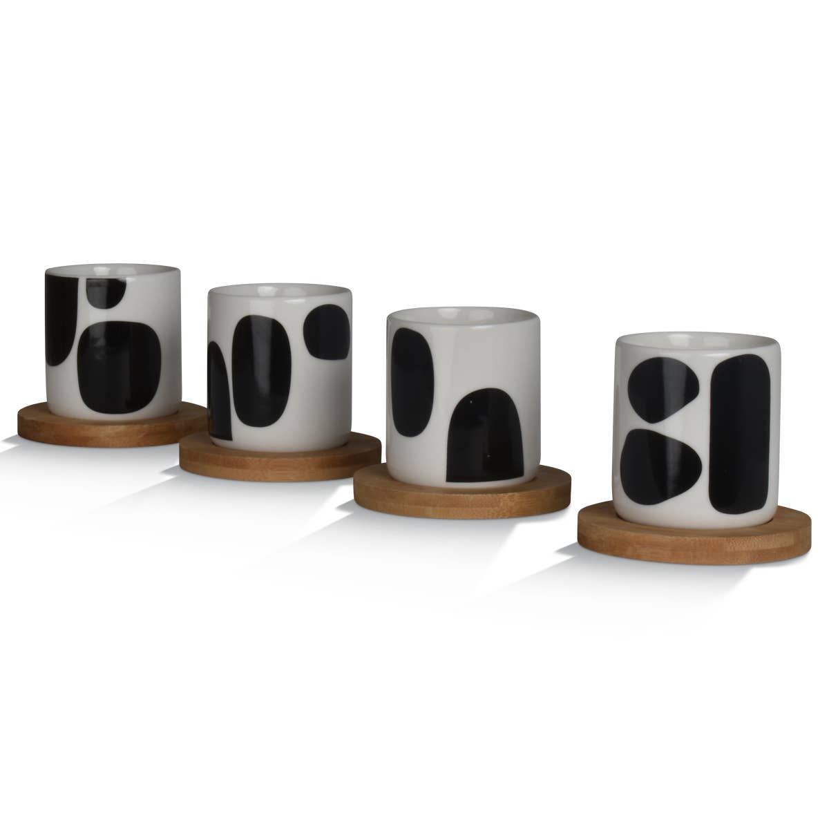 Set containing 4 earthenware cups (100 ml) and bamboo saucers. The cups are dishwasher and microwave safe. Oiled bamboo saucers should not be put in the dishwasher or microwave. Material: Earthenware. Diameter: 5.70 cm.